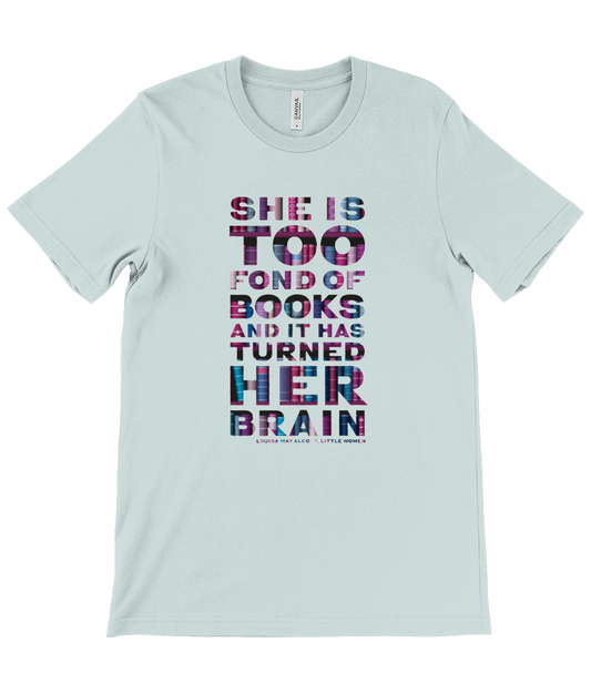 Unisex t-shirt "She is too fond of Books it has turned her brain" Book lover gift, librarian gift, bookworm, book nerd