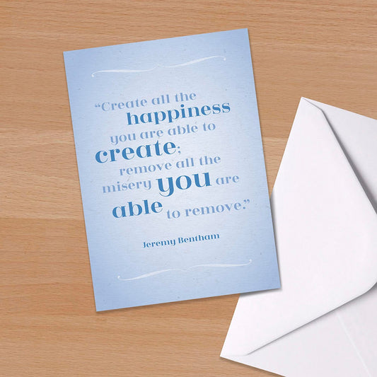 Literary Quote card - Create all the happiness you are able to create, Remove all the misery, Happiness, Just Because, Jeremy Bentham,